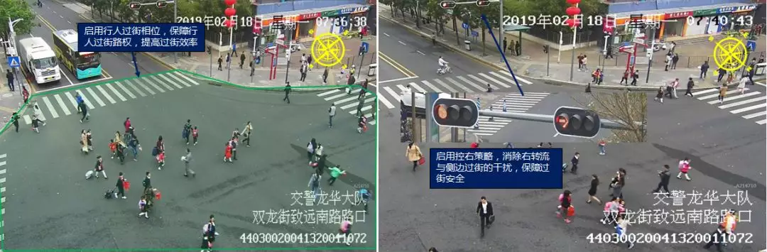 民治街道玉龍學校周邊信號路口致遠/龍匯路口在上學時段啟用機動車控右策略,在開學當天上下學時段通過對機動車采取控右策略,避免右轉流與側邊行人過街的干擾,消除安全隱患。