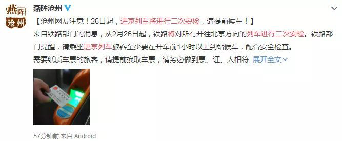 深圳特區(qū)報(bào)2019年3月1日訊 坐火車往北京方向的乘客注意啦!全國鐵路將對所有開往北京方向的列車進(jìn)行二次安檢,即旅客在車站各進(jìn)站口安檢后還需要前往固定區(qū)域再進(jìn)行一次安檢。