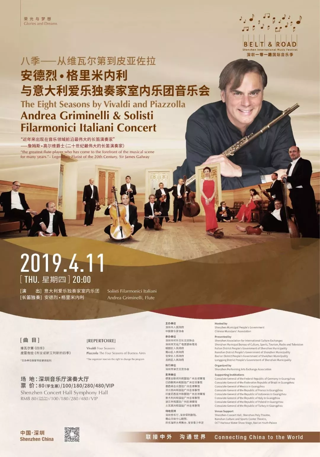 長(zhǎng)笛名家安德烈 格里米內(nèi)利,世界三大男高音之一帕瓦羅蒂推崇的長(zhǎng)笛大師,攜意大利愛(ài)樂(lè)獨(dú)奏家室內(nèi)樂(lè)團(tuán),首次到訪深圳,用音樂(lè)鏈接跨越時(shí)空的《四季》。