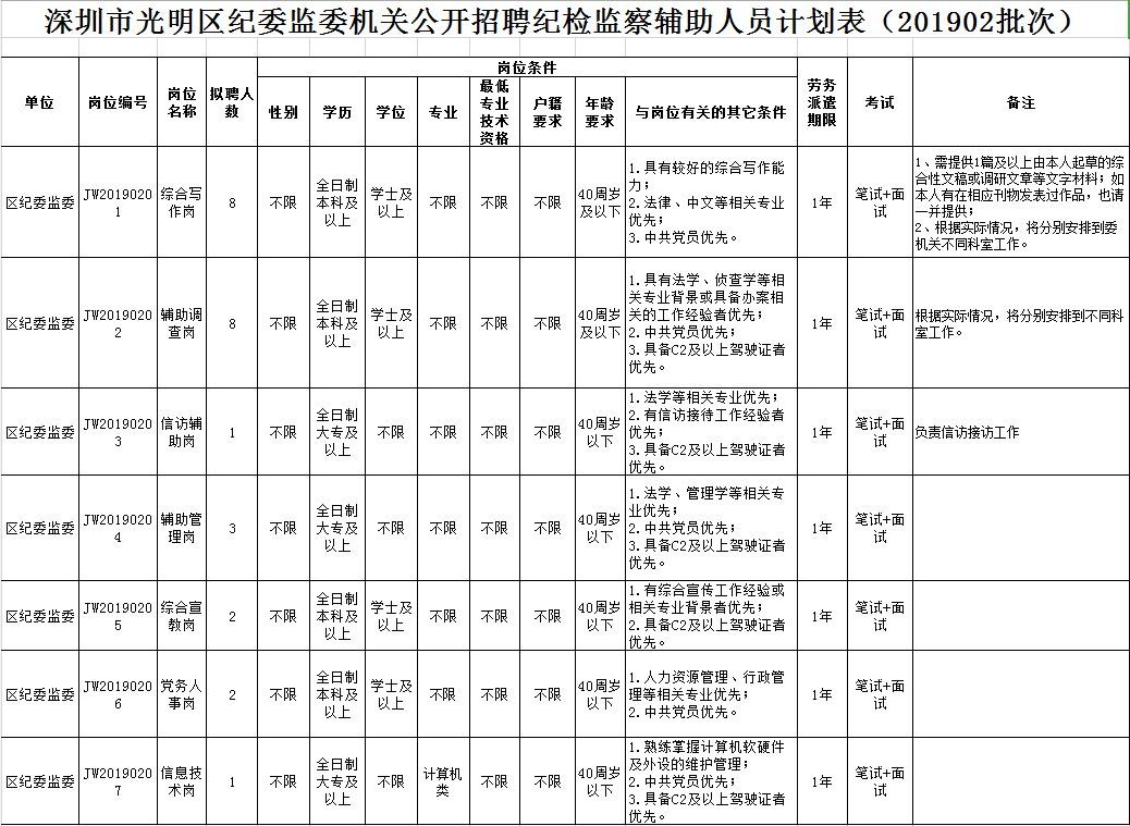 深圳市光明區(qū)紀委監(jiān)委機關公開招聘紀檢監(jiān)察輔助人員計劃表(201902批次)