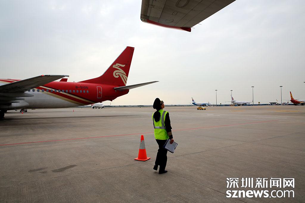 崔陽(yáng)仰頭檢查飛機(jī)機(jī)翼情況