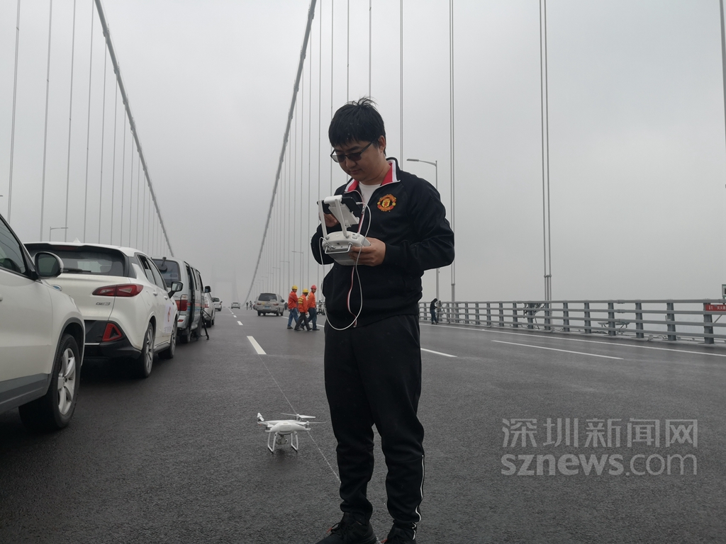 深圳新聞網(wǎng)記者齊釗遠(yuǎn)在橋面上調(diào)試無人機(jī),準(zhǔn)備航拍虎門二橋(現(xiàn)名南沙大橋)