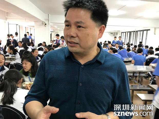 4月1日中午,深圳市福田區(qū)外國語學(xué)校校長丁長義跟學(xué)生一起在食堂就餐