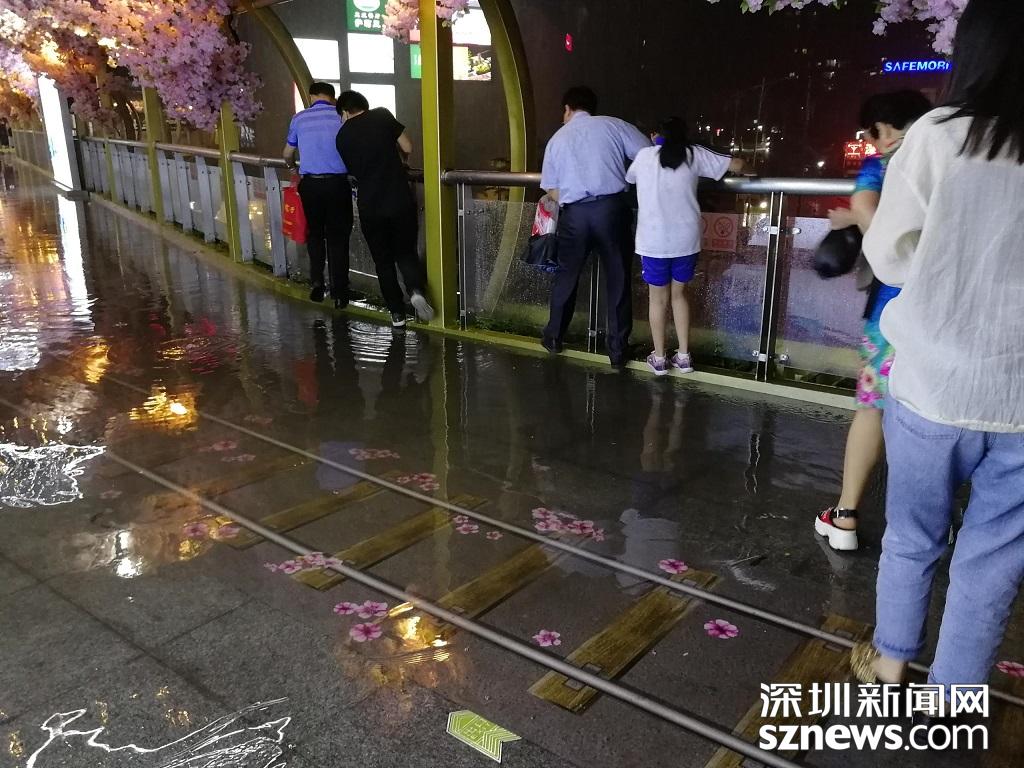 深圳暴雨特效開啟,市民紛紛進(jìn)入躲雨模式。(記者 邱曉潔 攝于丹竹頭地鐵站)