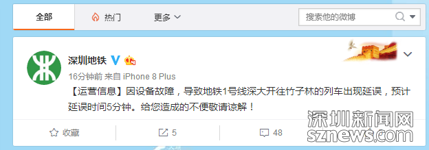 這周的星期一,深圳地鐵1號線深大開往竹子林列車延誤