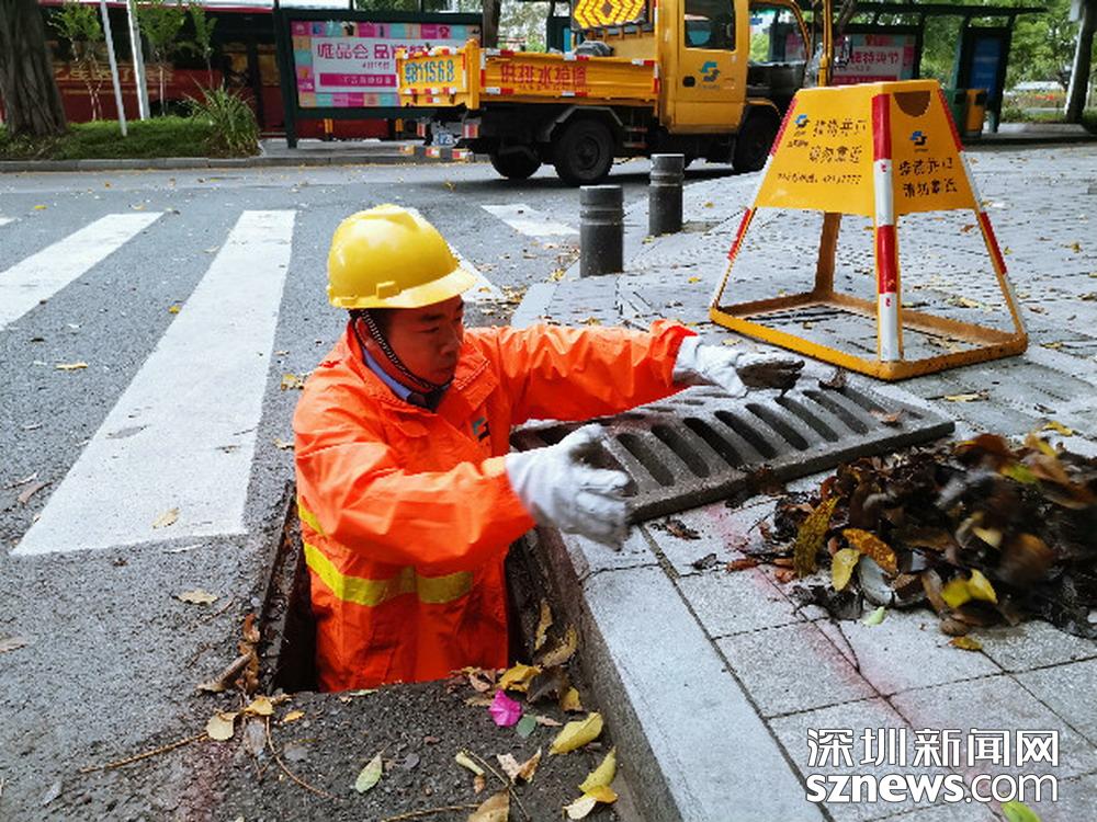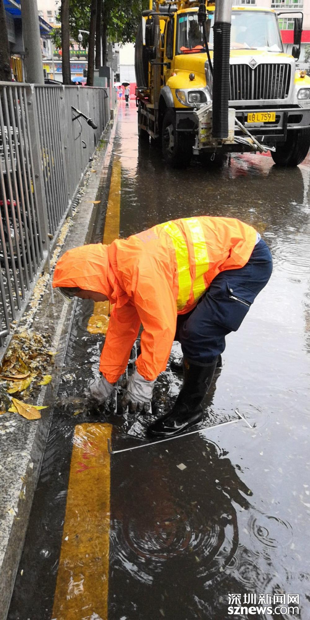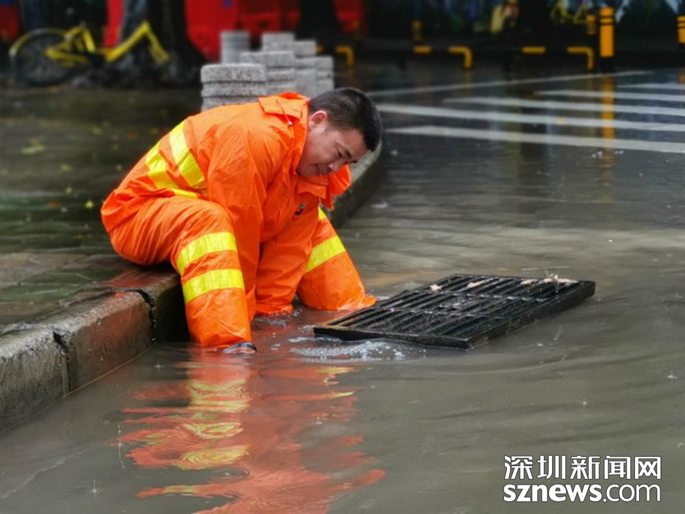 福田區(qū)深南路證券大廈前,工作人員正打開(kāi)雨水篦子加速排水