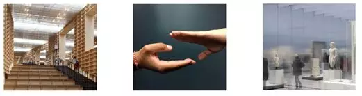 在外部觀看這兩座建筑,像是上下合并的雙手,在兩座建筑中間創(chuàng)造出了不同層次的公共平臺,南側(cè)入口廣場拾級而上進(jìn)入到第二圖書館前的廣場,其上預(yù)留豐富的空間意向,圖書市場、閱讀、散步、展覽、演講……而這個廣場又與美術(shù)館前的地面庭院巧妙相連,在大雨蓬的覆蓋下,是美術(shù)館的戶外雕塑廣場;它們?yōu)槌鞘刑峁┝斯部臻g并承接著城市的軸線。平臺擴充了建筑的功能,抬高的空間使它遠(yuǎn)離城市的喧囂,其上懸挑的屋蓋為其提供了庇護(hù),營造出了舒適的氛圍。