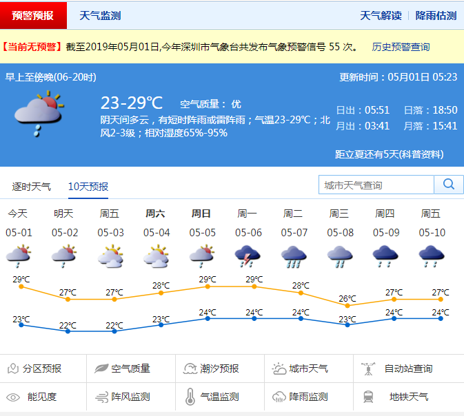 深圳新聞網(wǎng)2019年5月1日訊 深圳市氣象局預(yù)計(jì)1日陰天間多云,有陣雨或雷陣雨,23-29℃;2-6日多云為主,間中有短時(shí)陣雨,其中2-3日沿海、高地和海區(qū)有7-8級(jí)偏東風(fēng)。