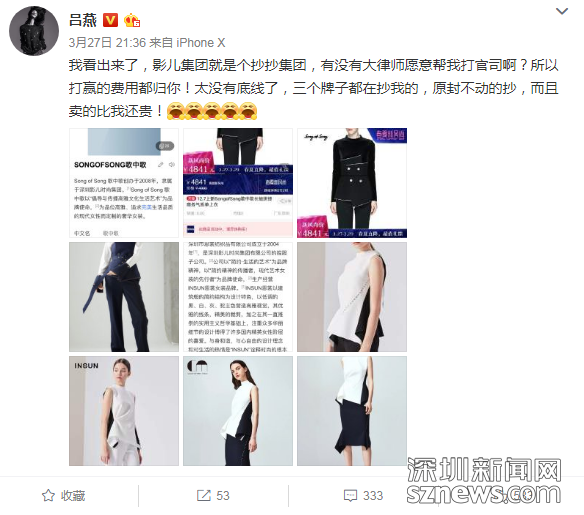 無獨有偶。5月5日,深圳影兒時尚集團(以下簡稱:影兒集團)正式向深圳市中級人民法院提起訴訟請求,就超模呂燕多次在微博上指責影兒集團是“抄抄集團”,造成影兒集團重大名譽損失和巨額經(jīng)濟損失一事,起訴超模呂燕及其公司上海是你商貿(mào)有限公司不正當競爭,要求兩被告立即停止侵權行為,賠償經(jīng)濟損失1000萬元,并公開道歉。