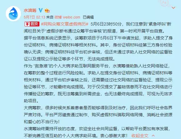 水滴籌官方微博稱,據(jù)平臺(tái)信息系統(tǒng)記錄顯示,記者提交的虛假眾籌款項(xiàng)目于5月6日下午申請(qǐng)發(fā)起,求助人提交了身份證明材料、病情證明等相關(guān)材料。