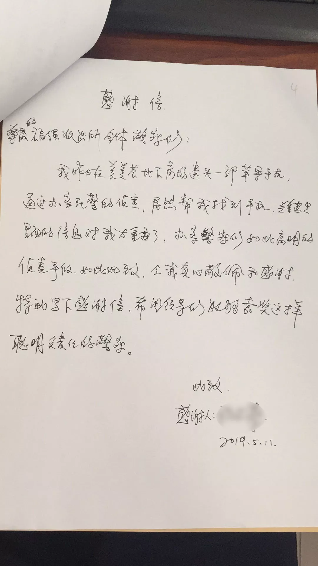 “手機(jī)里面的信息太重要了,辦案警察們?nèi)绱烁呙鞯膫刹槭侄?,如此?xì)致,令我真心敬佩和感謝!”5月11日晚,程女士在福強(qiáng)派出所的前臺(tái)激動(dòng)地手寫了這封感謝信。