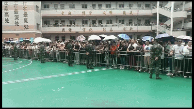 當(dāng)天在蜂擁的人群中,有一個(gè)人在家長(zhǎng)群里火了,視頻里他身穿警服,拿著喇叭在現(xiàn)場(chǎng)維持秩序。