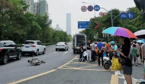 現(xiàn)場(chǎng)可以看到。橙色SUV已經(jīng)停在路邊。車(chē)旁是一輛被撞翻的電單車(chē),救護(hù)車(chē)到達(dá)現(xiàn)場(chǎng)后,迅速對(duì)男子實(shí)施搶救。