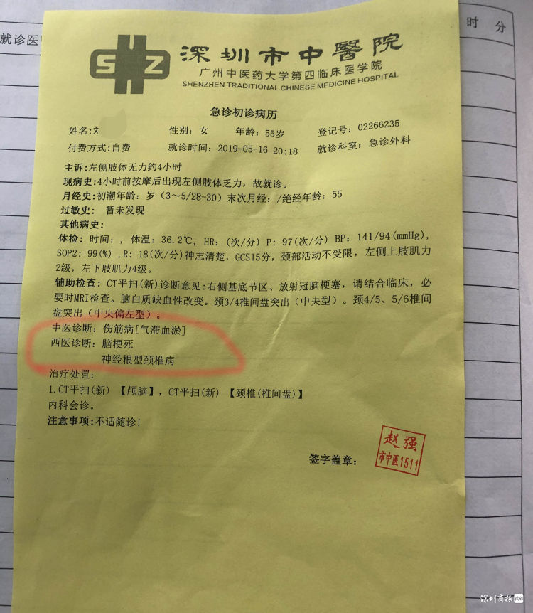 劉女士告訴記者,其事先已告知店家自己曾有過(guò)腦震蕩,但店家稱(chēng)可以進(jìn)行按摩。"按摩師是用胳膊的紂關(guān)節(jié)大力按壓我的左側(cè)頸椎脖子部位,我痛得受不了,但按摩師表示痛就是刺激穴位。"大約20多分鐘左右后,劉女士左手左腰左腿開(kāi)始麻木動(dòng)不了,人不能翻身。