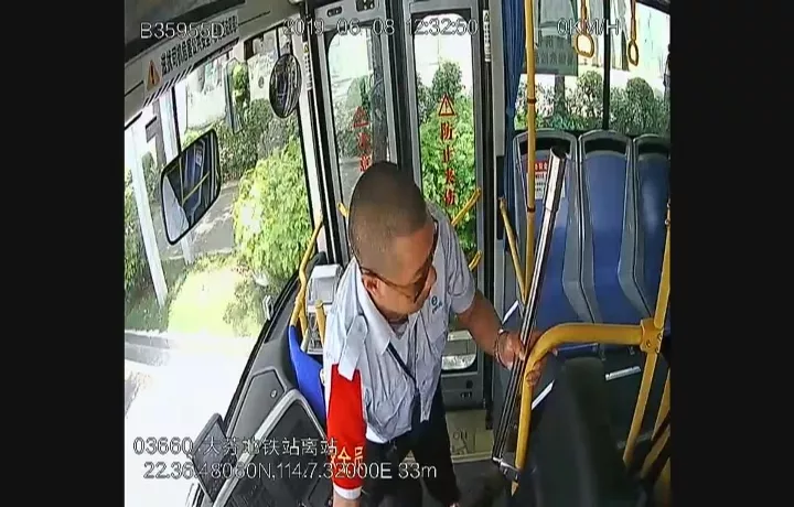 監(jiān)控顯示:6月8日中午12點(diǎn)27分左右,司機(jī)熊師傅正常駕駛車輛,這時(shí)身旁的一名穿黑色上衣的男乘客突然跌倒在地。熊師傅發(fā)現(xiàn)后,急忙將車輛行駛到安全地帶停放,并向男乘客詢問情況。