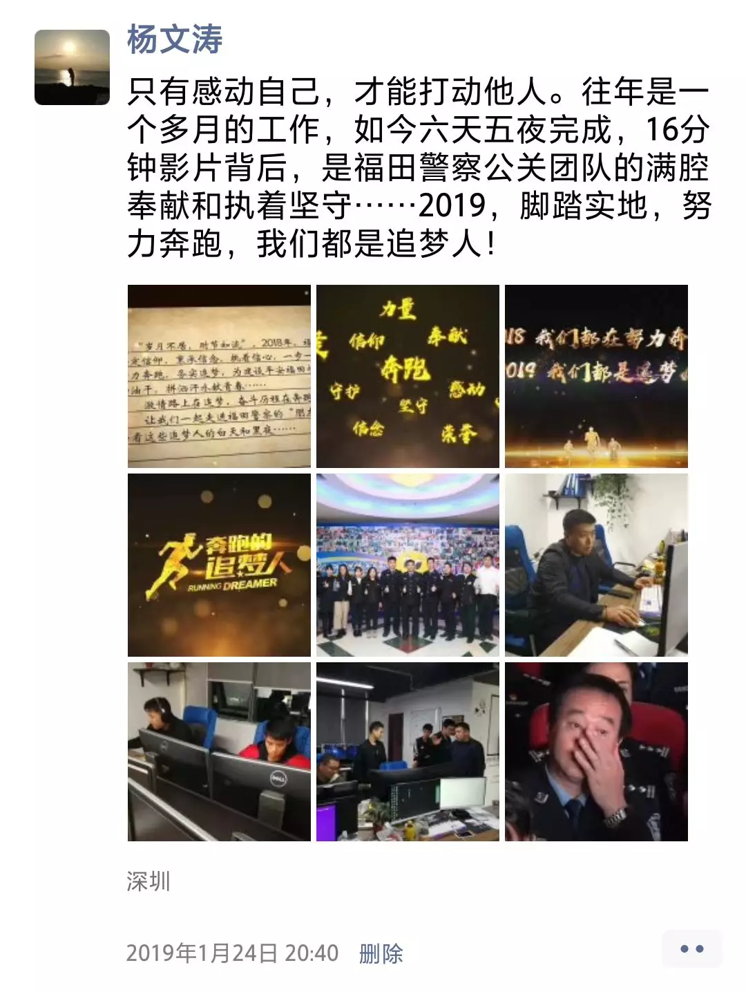 ▲福田派出所輔助人員朱峰朋友圈