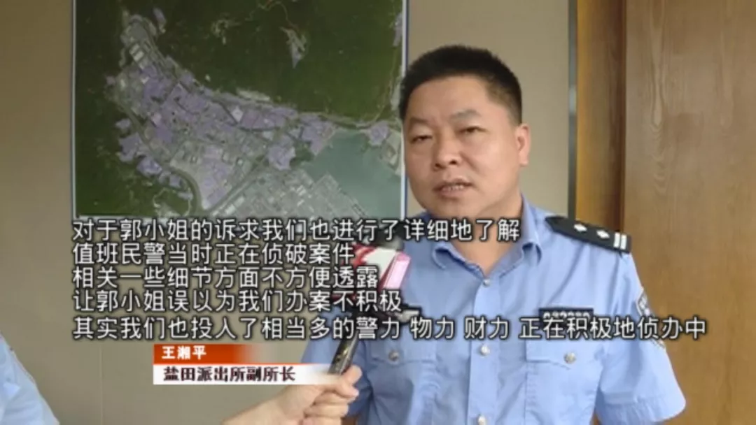 派出所表示,案件正在偵查當(dāng)中記者也和郭女士來到鹽田派出所,由于負(fù)責(zé)此案的蔡警官正值休假,派出所的一位值班領(lǐng)導(dǎo),對郭女士當(dāng)時所遭遇的處境,進行了情況說明。