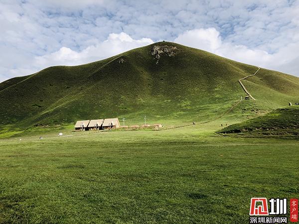 次日早上起來,見昆侖雪山近在咫尺,陽光照射在雪山頂上,倍感圣潔耀眼。雪山下面是綠綠的草原,草原上羊兒成群,馬兒四處奔跑,加上白色的蒙古包點綴其中,風(fēng)景十分迷人。身在草原上周身舒暢,心情自然也明朗起來。一條木制棧道沿山而上,像條長龍盤旋在山上,登高望遠,風(fēng)景如畫。