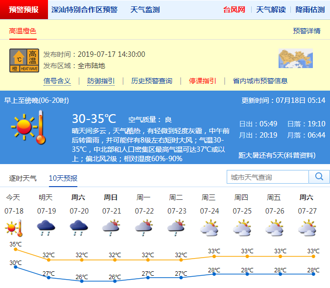 深圳新聞網(wǎng)2019年7月18日訊 受臺風(fēng)“丹娜絲”外圍下沉氣流影響,昨日我市高溫天氣加劇,全市最高39℃,出現(xiàn)在羅湖區(qū)東湖街道。市氣象臺于昨日14時30分將全市高溫黃色預(yù)警信號升級為橙色。這也是今年我市首個高溫橙色預(yù)警信號。