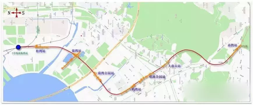 深圳地鐵5號(hào)線南延線(二期工程)北起于5號(hào)線前海灣站,經(jīng)前海、南山,終點(diǎn)與地鐵2號(hào)線赤灣站換乘。