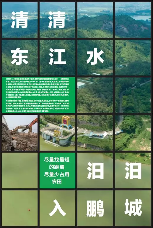 第三部分“清清東江水汩汩入鵬城”,著重展示東江水源工程建設(shè)的全過(guò)程。以工程線路為展覽線索,再現(xiàn)水務(wù)工作者在長(zhǎng)達(dá)106公里的戰(zhàn)線上奮戰(zhàn)的場(chǎng)面。通過(guò)輸水設(shè)施的新舊照片對(duì)比,描繪出一條在深惠兩城平地崛起的深圳“生命線”。