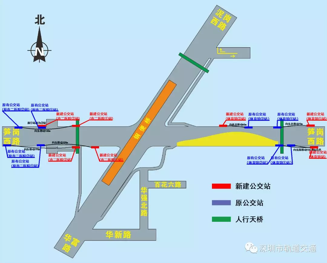 在本次調(diào)整中,華富路-泥崗西路南北向交通只能通過鋼便橋雙向六車道行車。泥崗西路、華富路、筍崗西路左轉(zhuǎn),行人線路及“市二醫(yī)院”,“體育館”公交站臺(tái)均有所調(diào)整。