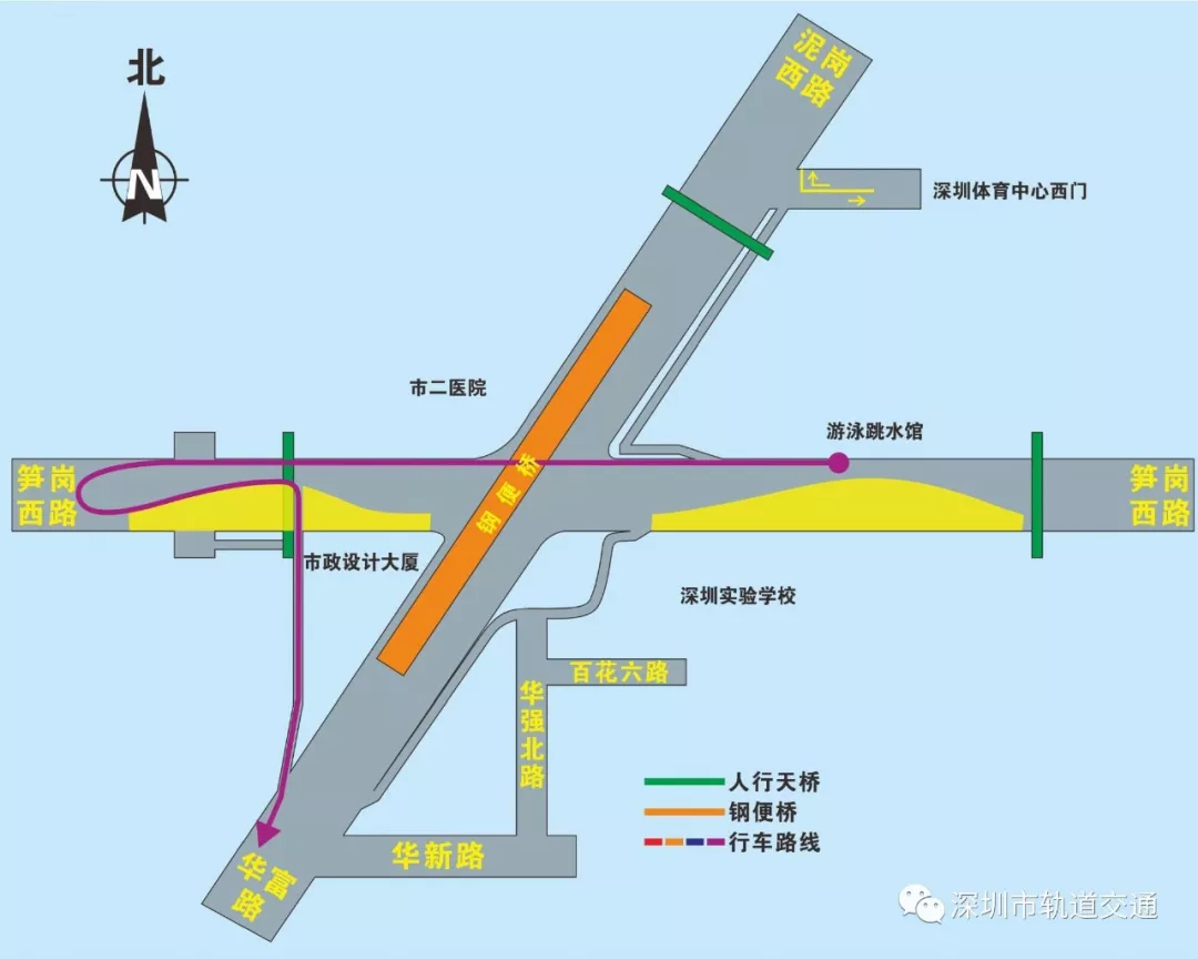 東轉南(筍崗西路左轉華富路):筍崗西路向西直行通過原平交路口,隨后在掉頭口處掉頭,通過華富支路,實現(xiàn)左轉華富路。(詳見圖6)