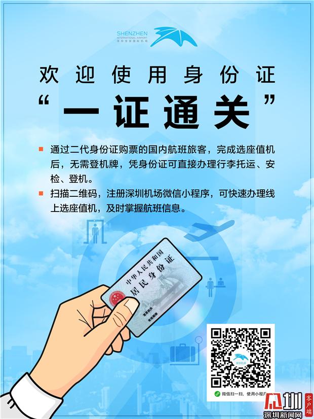 深圳新聞網(wǎng)2019年8月1日訊(見圳客戶端、深圳新聞網(wǎng)記者 涂勝 通訊員 葉丹)記者從深圳機(jī)場了解到,即日起,深圳機(jī)場全面試行國內(nèi)航班身份證“一證通關(guān)”服務(wù)。今后,使用二代身份證購買機(jī)票的旅客,在完成選座值機(jī)后,僅需出示身份證即可直接辦理行李托運(yùn)、安檢和登機(jī)手續(xù),全程無需再出示登機(jī)牌。