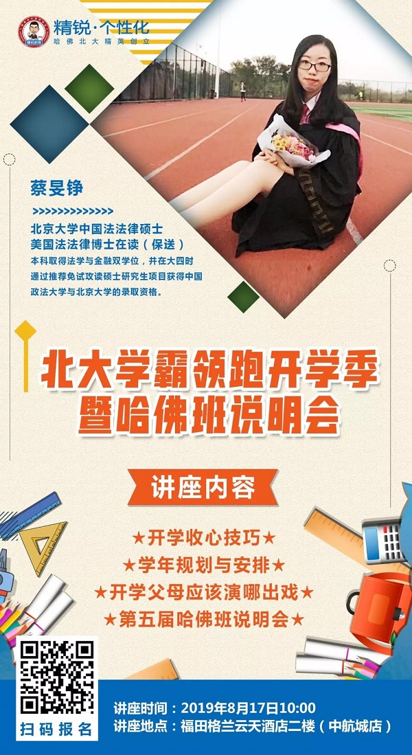 為了幫助深圳的孩子擺脫假期綜合征,快速適應(yīng)新年級帶來的變化,《北大學(xué)霸領(lǐng)跑開學(xué)季》公益講座特別邀請到北大學(xué)霸蔡旻錚學(xué)姐于本周六和深圳的家長、學(xué)生分享開學(xué)收心技巧,如何做好學(xué)年規(guī)劃與安排。