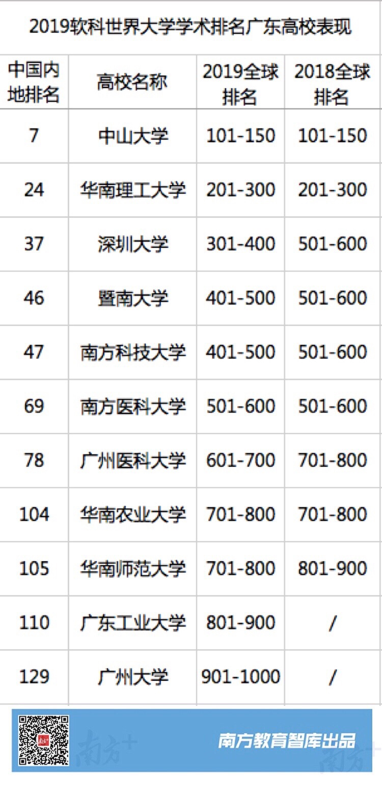 廣東高校共有11所上榜,上榜數(shù)量?jī)H次于江蘇(20所)和北京(19所),排名第3。中山大學(xué)位居全球101-150位,中國(guó)內(nèi)地第7名;華南理工大學(xué)全球201-300位,位列中國(guó)內(nèi)地第24位。此次進(jìn)步最大的是深圳大學(xué),從去年全球501-600位飆升至301-400位,全國(guó)排名第37名。進(jìn)步的還有暨南大學(xué)和南方科技大學(xué),升至全球401-500位。