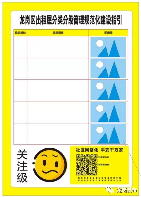 出租屋將分為寬管級(jí)(綠標(biāo))、關(guān)注級(jí)(黃標(biāo))、嚴(yán)管級(jí)(橙標(biāo))、禁止級(jí)(紅標(biāo))四個(gè)級(jí)別。結(jié)合房屋二維碼對(duì)四個(gè)級(jí)別實(shí)行動(dòng)態(tài)標(biāo)色管理,以房屋二維碼的底色來(lái)標(biāo)注。