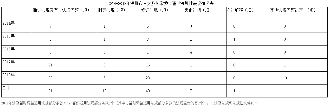 2018年,深圳在立法保障改革、立法推動(dòng)改革、立法規(guī)范改革方面的步伐越邁越大,在加大特區(qū)立法權(quán)使用,制定特區(qū)條例促進(jìn)改革創(chuàng)新和保障經(jīng)濟(jì)社會(huì)發(fā)展外,根據(jù)改革的需要,及時(shí)修改和廢止與經(jīng)濟(jì)社會(huì)發(fā)展不相符的法規(guī),采用暫停法規(guī)性文件的適用、暫時(shí)調(diào)整和暫停法規(guī)部分條款適用的方式,為改革探索提供法治依據(jù)。全年通過(guò)新的特區(qū)條例5項(xiàng),修訂法規(guī)23項(xiàng),廢止法規(guī)1項(xiàng),暫時(shí)調(diào)整和暫停適用法規(guī)10項(xiàng)。