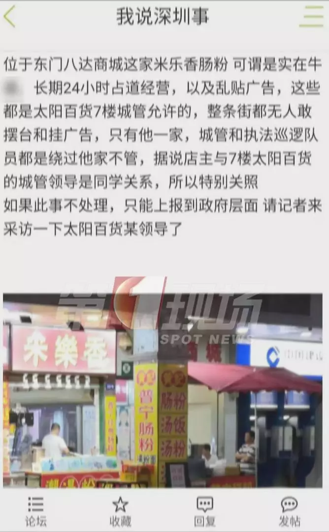 昨天,論壇上的一則帖子引起網(wǎng)友圍觀,帖子提到位于東門八達(dá)商城的米樂腸粉店,24小時(shí)占道經(jīng)營,亂貼廣告。整條街都不敢這么做,唯獨(dú)這家沒有城管管理,原因是店主跟7樓太陽百貨的城管領(lǐng)導(dǎo)是同學(xué)。