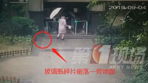 監(jiān)控畫面清楚拍到,當沈女士即將走到小區(qū)出口時,天上突然墜落一個東西,砸在了她的雨傘上。驚魂未定的她向前走了幾步,才看清楚,剛剛砸到自己雨傘的,是一個啤酒玻璃瓶!