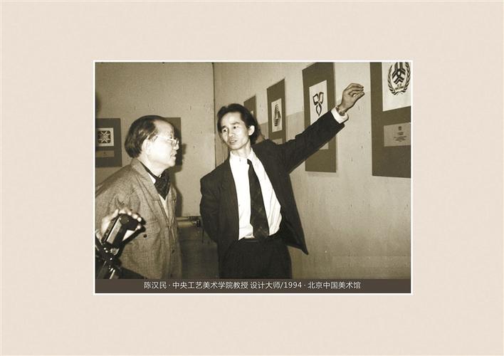 ▲1994年,《莊玉君標(biāo)徽設(shè)計(jì)書畫展》在中國(guó)美術(shù)館展出,莊玉君向中央工藝美術(shù)學(xué)院教授陳漢民介紹標(biāo)徽。