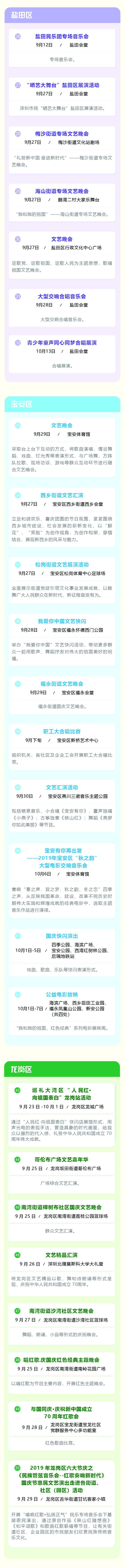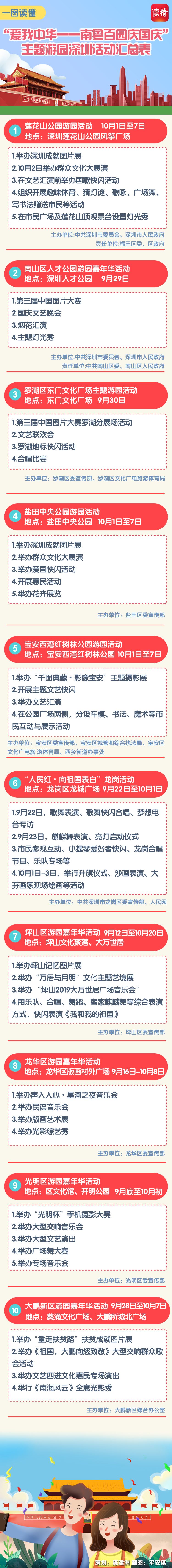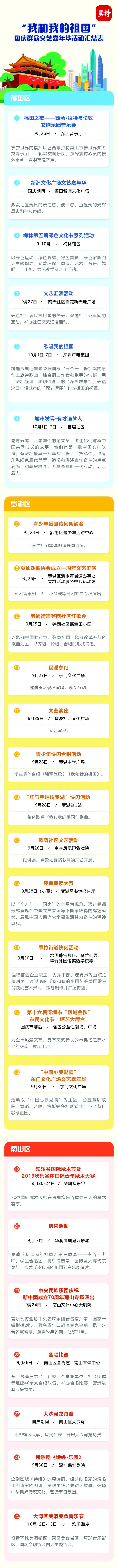 為慶祝中華人民共和國(guó)成立70周年,深圳市將舉辦專場(chǎng)音樂(lè)會(huì)、群眾文藝晚會(huì)、焰火晚會(huì)等活動(dòng),同時(shí)將舉行10場(chǎng)“愛(ài)我中華——南粵百園慶國(guó)慶”主題游園及80場(chǎng)“我和我的祖國(guó)”國(guó)慶群眾文藝嘉年華活動(dòng)。主題游園和文藝嘉年華活動(dòng)安排如下: