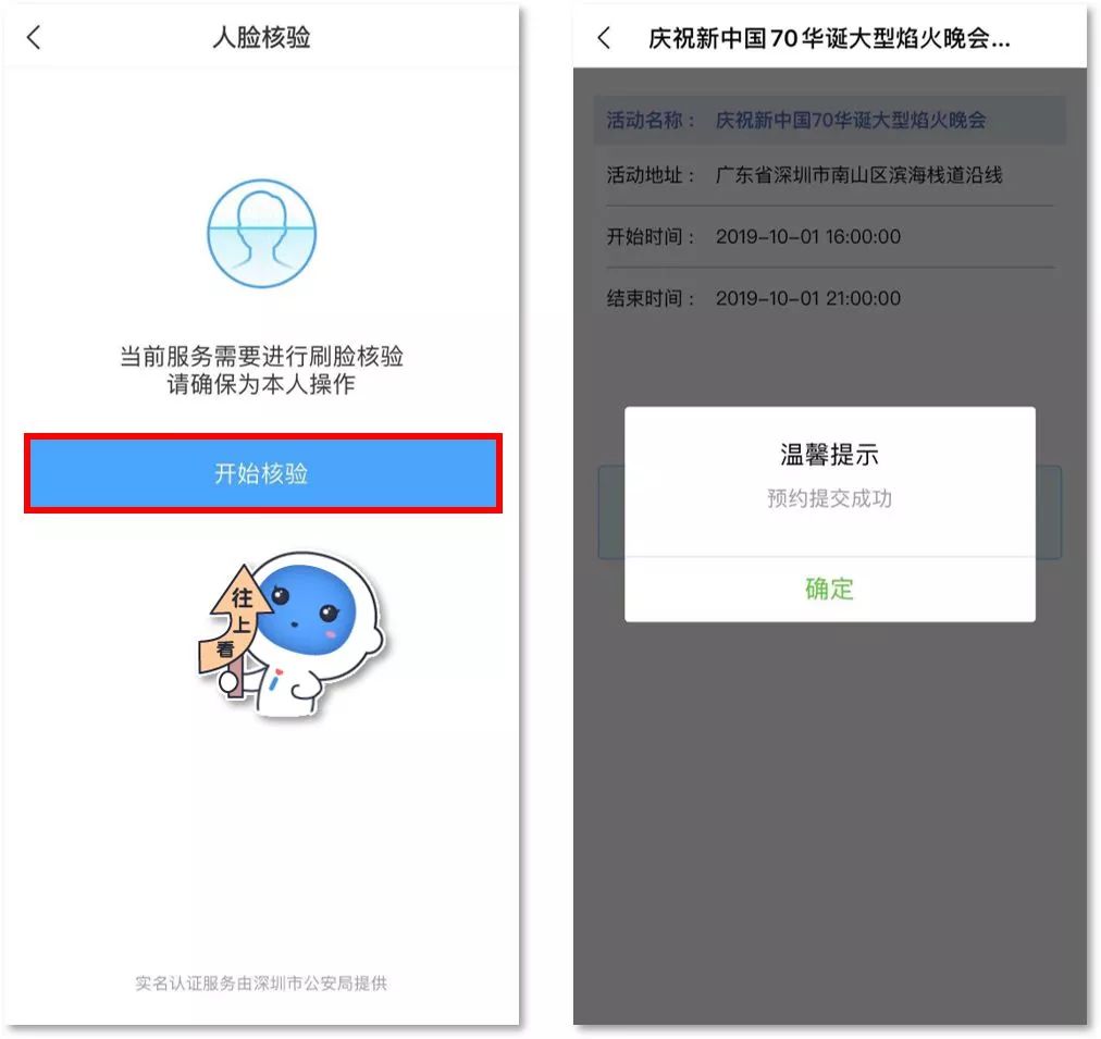 1.關(guān)注“深圳公安”微信公眾號(hào),選擇“民生”欄,點(diǎn)擊焰火晚會(huì)預(yù)約,通過(guò)人臉認(rèn)證后即可進(jìn)入預(yù)約頁(yè)面,如下圖所示:
