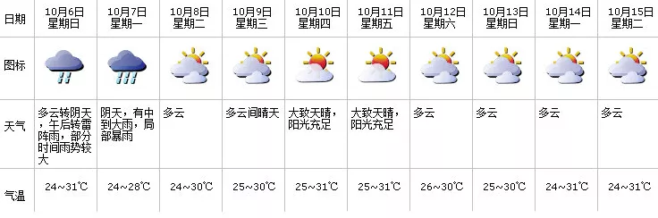 今明兩日有中到大雨,局部暴雨,降雨集中在6日午后至7日上午,部分時間伴有雷暴,沿海和高地陣風(fēng)6-8級,6日氣溫24-31℃;8-11日多云到晴天;12日有小雨。假期返程高峰期有明顯降雨和大風(fēng),請加強(qiáng)海上活動和道路交通安全的管理。