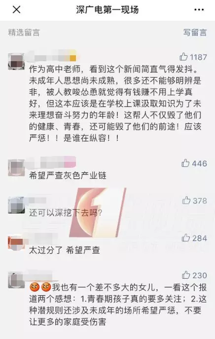 其中一位網友說:作為高中老師,看到這個新聞簡直氣得發(fā)抖。未成年人思想尚未成熟,很多還不能夠明辨是非,被人教唆慫恿就覺得有錢賺不用上學真好,但這本應該是在學校上課汲取知識,為了未來理想奮斗努力的年齡!這幫人不僅毀了他們的健康、青春,還可能毀了他們的前途!應該嚴懲,是誰在縱容!