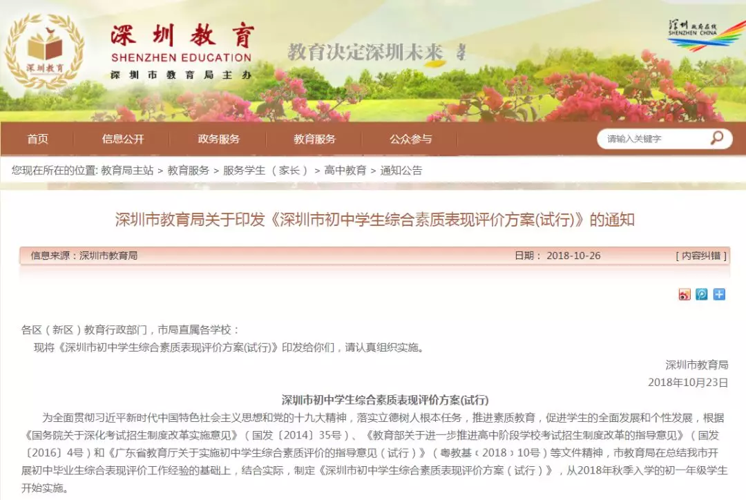 據(jù)了解,《綜評(píng)方案》主要包含思想品德、學(xué)業(yè)水平、身心健康、藝術(shù)素養(yǎng)和實(shí)踐創(chuàng)新等5個(gè)方面,以寫實(shí)記錄、學(xué)生成長(zhǎng)過(guò)程性資料記錄、評(píng)語(yǔ)評(píng)價(jià)及重要觀測(cè)點(diǎn)計(jì)分評(píng)價(jià)相結(jié)合的形式評(píng)價(jià)深圳市初中學(xué)生綜合素質(zhì)表現(xiàn),并從2018年秋季入學(xué)的初一新生開始實(shí)施。