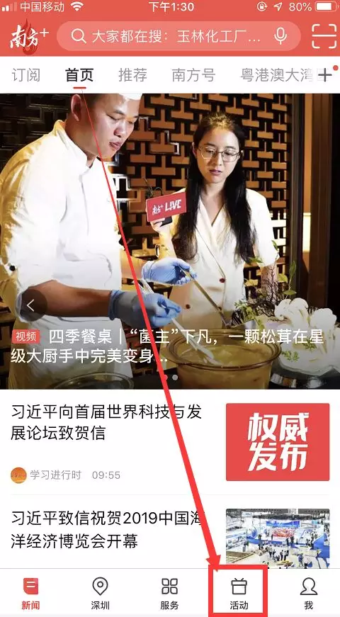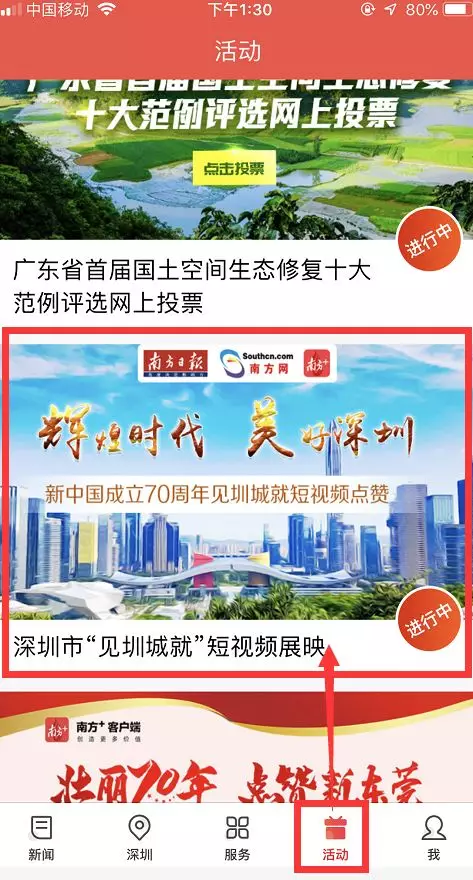 2、打開南方+客戶端首頁,在首頁底部菜單欄點(diǎn)擊“活動(dòng)”