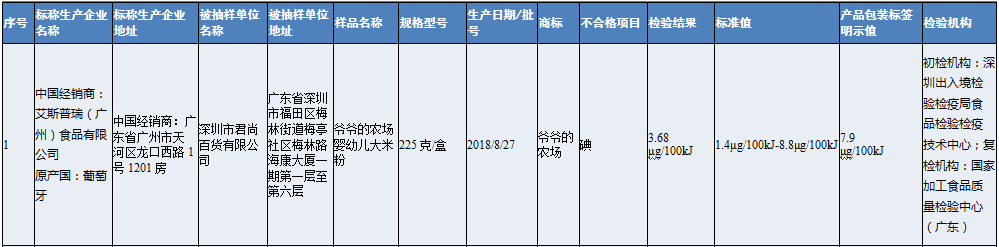 深圳市君尚百貨有限公司銷(xiāo)售的爺爺?shù)霓r(nóng)場(chǎng)嬰幼兒大米粉(原產(chǎn)國(guó):葡萄牙),其中碘檢出值低于產(chǎn)品包裝標(biāo)簽明示值的80%,營(yíng)養(yǎng)指標(biāo)不達(dá)標(biāo)。
