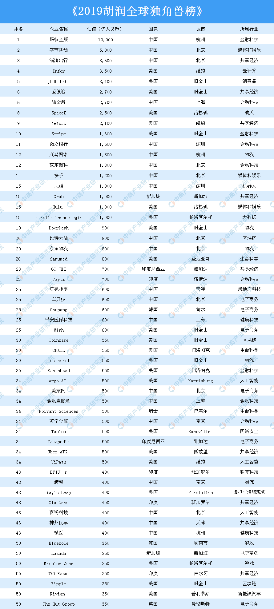 據(jù)悉,這是胡潤研究院首次發(fā)布全球獨角獸榜。此次榜單對全球估值10億美元以上的科技初創(chuàng)企業(yè)排名,上榜企業(yè)要求創(chuàng)辦不超過10年,獲得過私募投資且未上市。本次榜單估值計算截止日期為2019年6月30日。
