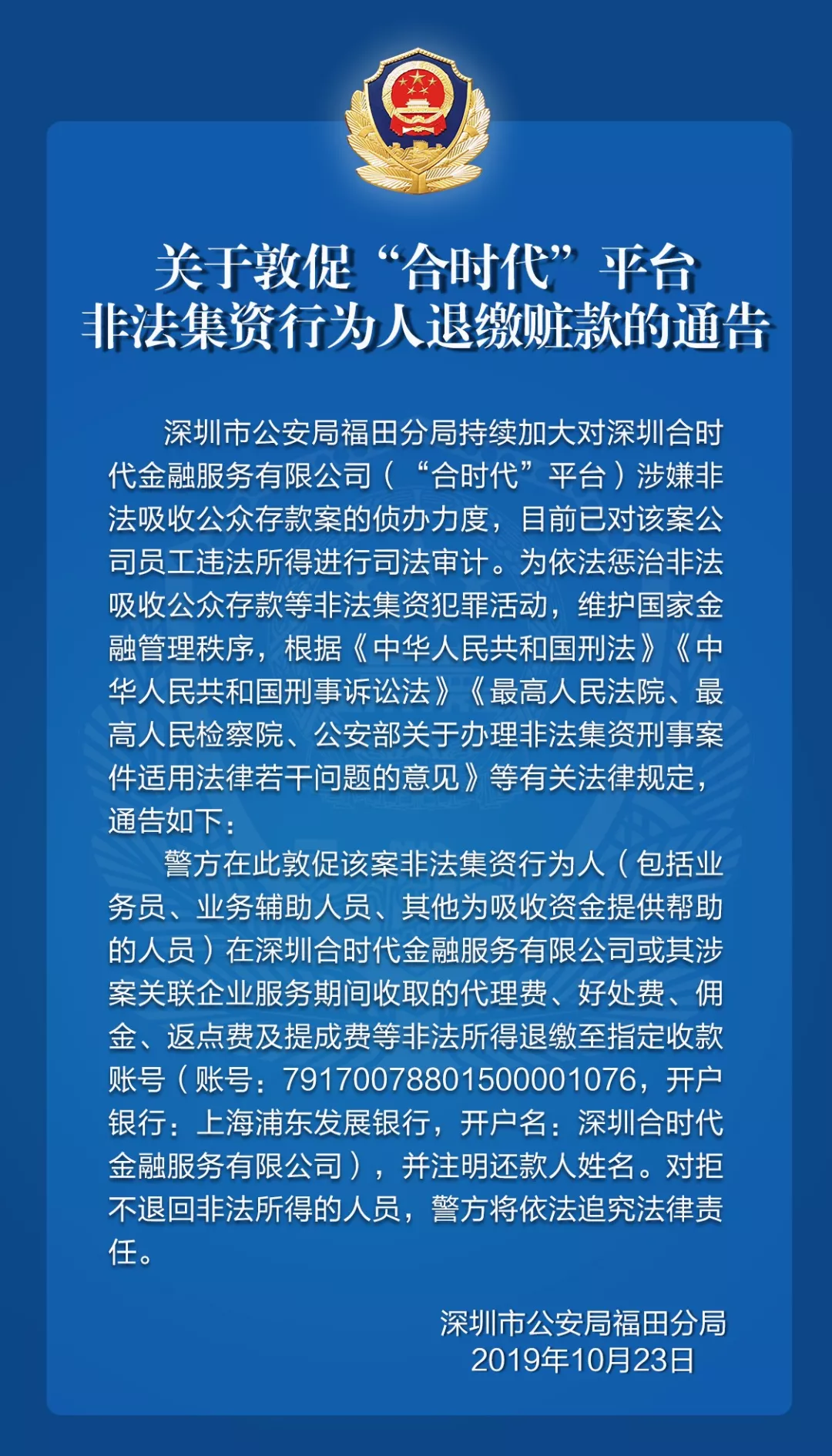 關于敦促“合時代”平臺非法集資行為人退繳贓款的通告