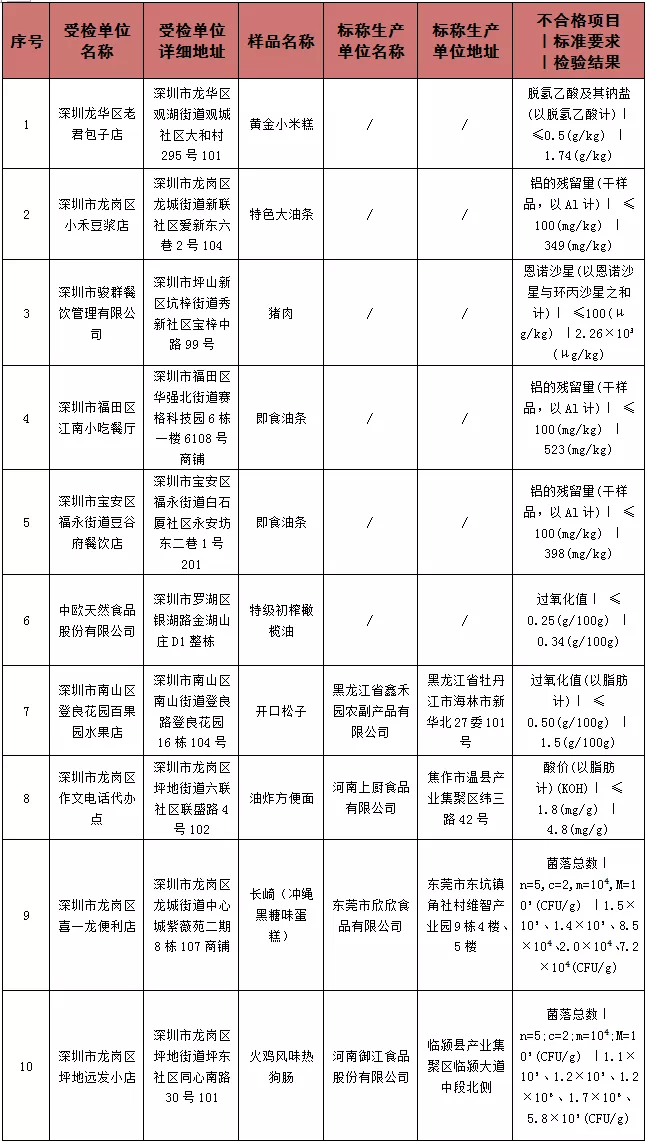 在本次抽檢中,深圳市龍崗區(qū)小禾豆?jié){店有一批次特色大油條、深圳市福田區(qū)江南小吃餐廳和深圳市寶安區(qū)福永街道豆谷府餐飲店的一批次即食油條被檢出不合格,不合格項(xiàng)目均為鋁的殘留量(干樣品,以Al計(jì))。