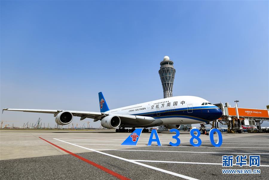 10月27日,南方航空空中客車A380客機(jī)停靠在深圳機(jī)場(chǎng)。當(dāng)日下午,由全球最大寬體客機(jī)——空中客車A380執(zhí)飛的南航CZ3153次航班由深圳起飛前往北京,標(biāo)志著這款“空中巨無(wú)霸”機(jī)型重返深圳機(jī)場(chǎng)。南航曾在2014年5月開始啟用A380執(zhí)飛京深航線,后因動(dòng)態(tài)運(yùn)力調(diào)配停飛。新華社記者毛思倩攝