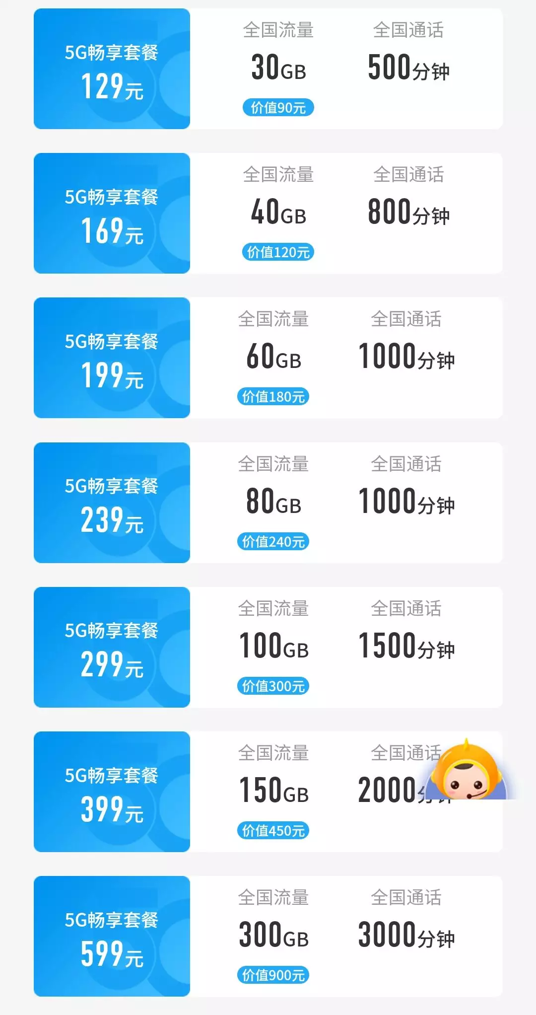 299元套餐:100G流量,1500分鐘通話時間