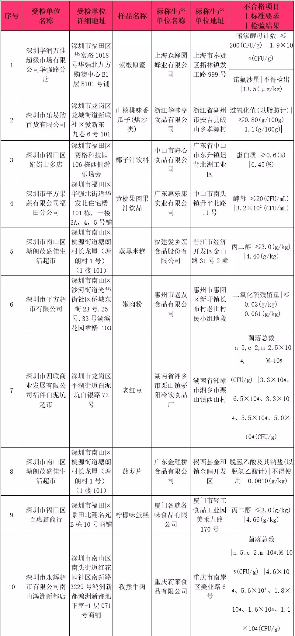 本次共抽檢流通環(huán)節(jié)食品918批次,涉及流通環(huán)節(jié)經(jīng)營(yíng)主體230家次,共檢測(cè)食品指標(biāo)5434項(xiàng)次。其中檢出不合格樣品10批次,涉及不合格食品類(lèi)別有炒貨食品及堅(jiān)果制品1批次,淀粉及淀粉制品1批次,蜂產(chǎn)品1批次,糕點(diǎn)2批次,冷凍飲品1批次,肉制品1批次,水果制品1批次,飲料2批次;涉及不合格項(xiàng)目類(lèi)別為獸藥殘留、品質(zhì)指標(biāo)、微生物污染、食品添加劑。