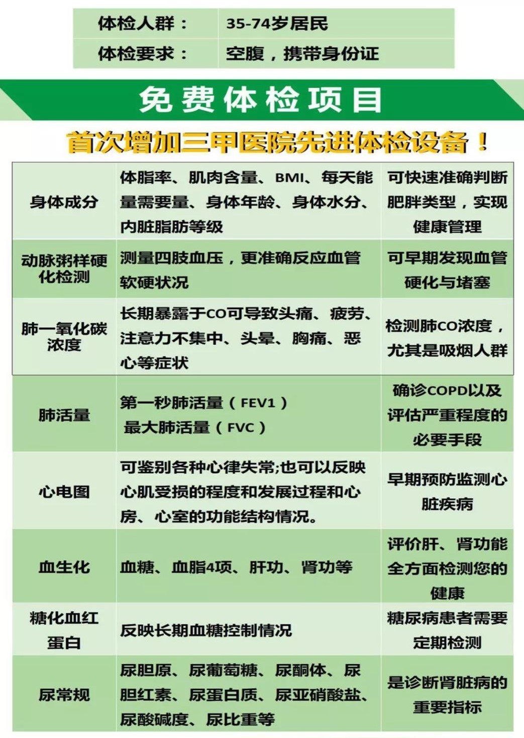 本次免費體檢面向35-74歲深圳居民,主要為居民提供的體檢項目包括:免費建立健康檔案,中醫(yī)體質(zhì)辨識服務(wù);免費檢測尿常規(guī)、血常規(guī);免費檢測血生化(血糖、肝功、腎功);免費做心電圖檢查;免費測量肺功能、肺一氧化碳含量;免費測量身體成份,判別自身的健康狀態(tài)。需要提醒的是,體檢要求空腹,且要攜帶身份證。