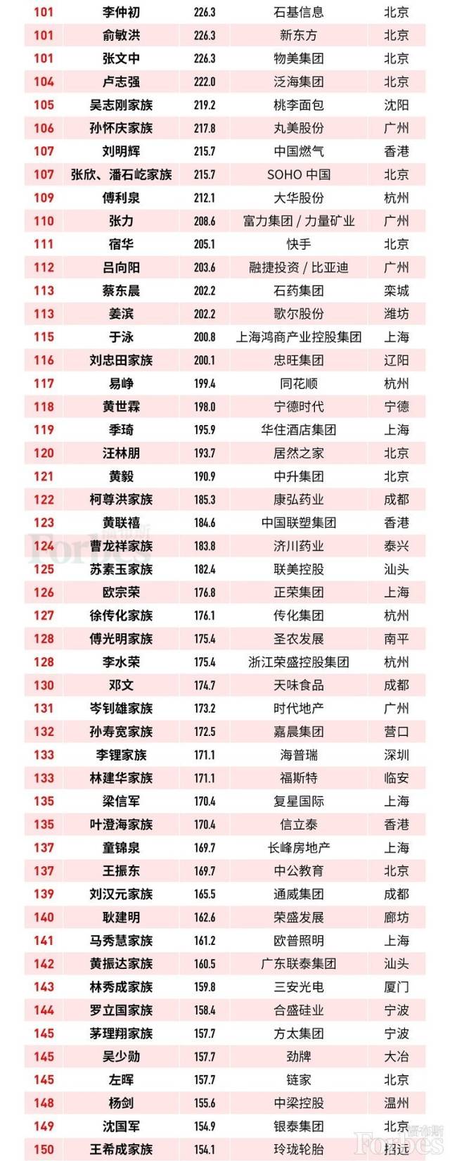 編制本榜單使用的持股和財務(wù)信息取自家族和個人、證交所、分析師和監(jiān)管機(jī)構(gòu)。資產(chǎn)計算使用的是截至10月25日的股價和匯率。非上市公司的估值基于對同類上市公司的分析評估。被抵押股權(quán)予以折價計算。與福布斯全球億萬富豪榜不同,福布斯中國富豪榜包括參與配偶生意的夫婦。一些估算還包括其他家族成員擁有的資產(chǎn)。